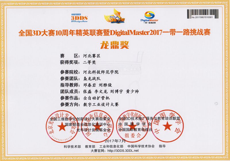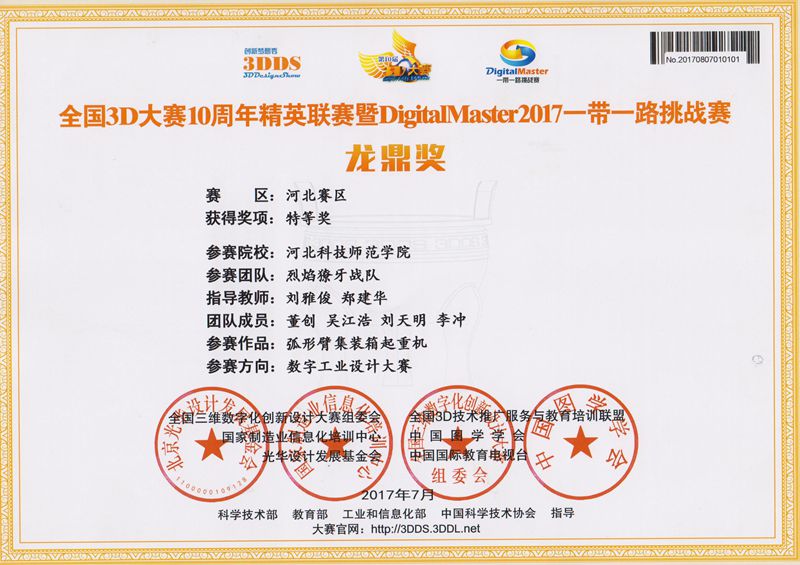 为参加全国3D大赛,开云kaiyun官方网站组建了由机制专业和农机专业的同学4支团队,在邓春岩、刘雅俊、张小芹等老师的精心指导下,综合运用所学的机械制图和三维建模技术,精心设计,积极创新。近日,经全国相关领域专家和教授评审,荣获大赛(河北赛区)特等奖1项、二等奖3项。