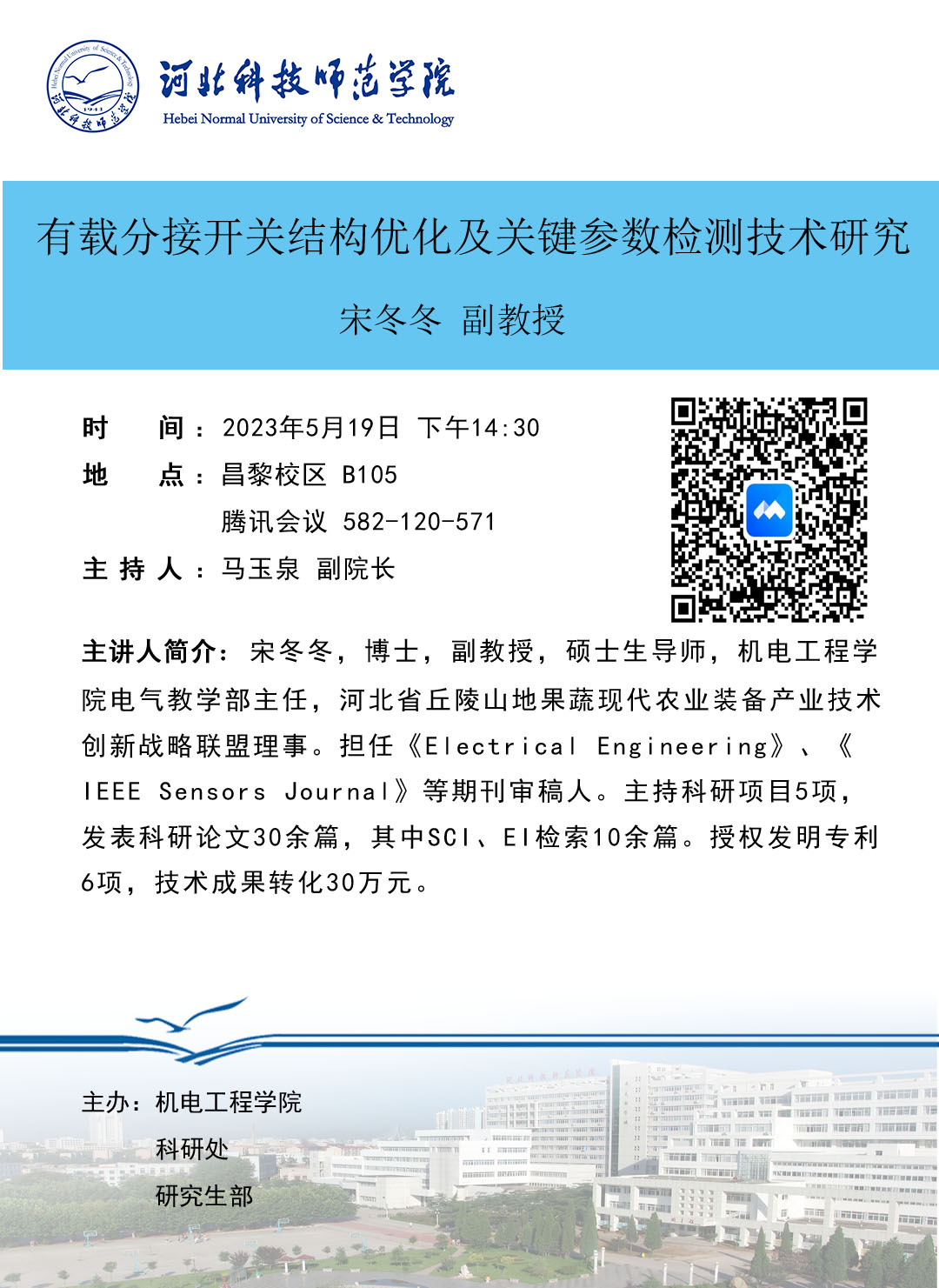 主讲人介绍:宋冬冬,博士,副教授,硕士生导师,开云kaiyun官方网站电气教学部主任,河北省丘陵山地果蔬现代农业装备产业技术创新战略联盟理事。担任《Electrical Engineering》、《IEEE Sensors Journal》等期刊审稿人。主持科研项目5项,发表科研论文30余篇,其中SCI、EI检索10余篇。授权发明专利6项,技术成果转化30万元。