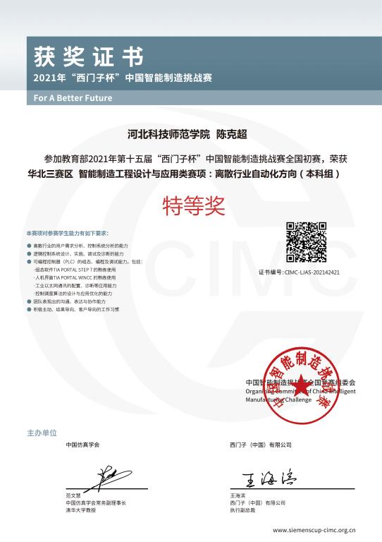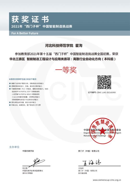 近日,2021年第十五届“西门子杯”中国智能制造挑战赛华北三赛区比赛(河北赛区)在华北理工大学成功举办。开云开云kaiyun官方网站9名同学组成的3支代表队参加了此次大赛,分别获得离散行业自动化方向(本科组)团体特等奖、一等奖、二等奖。