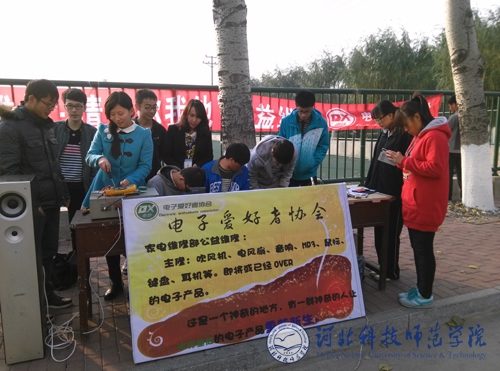 2014年11月8日上午,开云kaiyun官方网站举办“爱心维修•情系你我他”公益维修活动。面对损坏的电子物品,电子爱好者协会会员们耐心的进行维修,并向现场同学们进行讲解。当天,电子爱好者协会还在昌黎校区招聘会现场举办了作品展示活动,并与招聘单位,学校领导、老师进行现场交流。