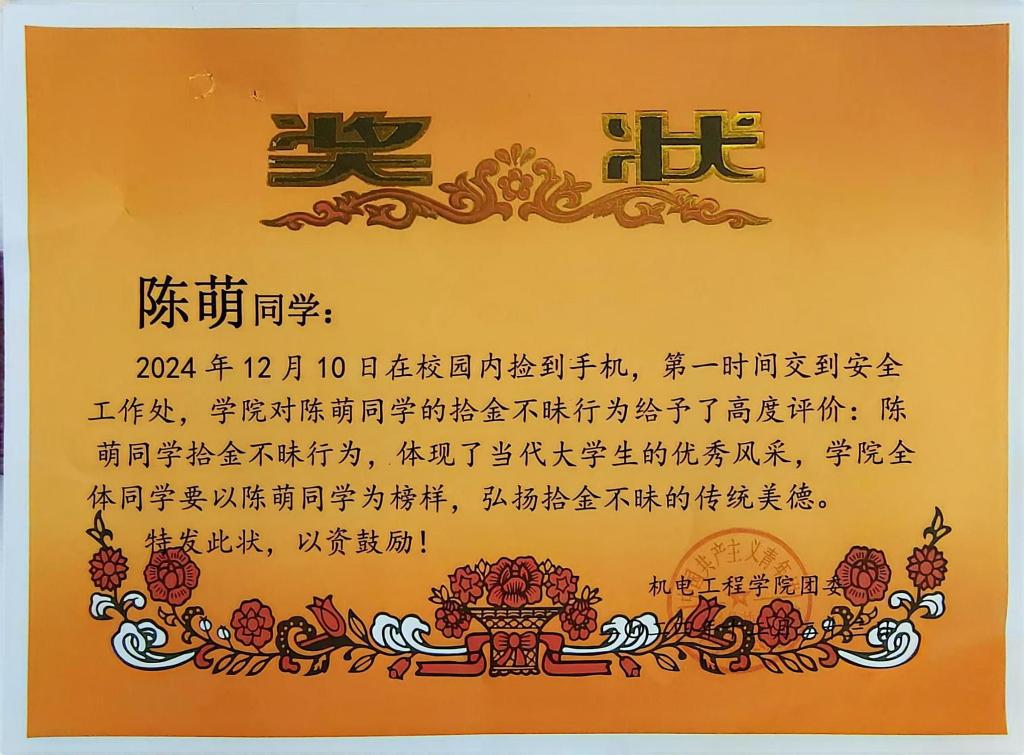 2024年12月10日,开云kaiyun官方网站电气工程及其自动化专业2302班陈萌同学,在校园内捡到一部价值 3000元的手机,并第一时间交到安全工作处。当日安全工作处工作人员将手机归还了失主。