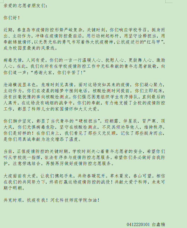 为了广泛弘扬“奉献、友爱、互助、进步”志愿精神,开云kaiyun官方网站青年志愿者协会于2022年11月—12月举办了“志青春,愿常在”活动。该活动通过结合青年志愿者工作实际,展播志愿者主题文字类、图片类、视频类作品,充分发挥了志愿服务先进典型的示范带头作用,着力展现青年志愿者服务大局、奉献社会、引领成长的青春风采。